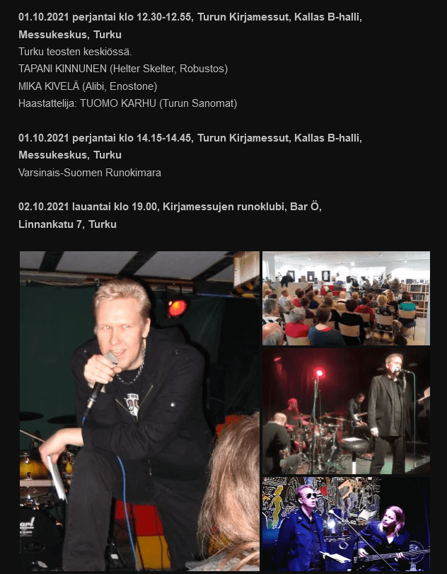 Turun Kirjamessut Posted on 24.9.2021 by caution2 Alibi myynnissä Enostonen osastolla ja Kivelä esiintymässä messuilla perjantaina 1.10. sekä messujen iltaklubilla Bar Ö:ssä lauantaina 2.10. Jaa tämä: Click to share on X(Avautuu uudessa ikkunassa) X Jaa Facebookissa(Avautuu uudessa ikkunassa) Facebook Tykkää Lataa...