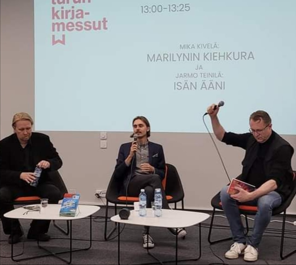 Turun Kirjamessuilla tapahtunutta Posted on 4.10.2022 by caution2 Santeri Skofelt haastatteli sunnuntaina 2.10. minua ja Jarmo Teinilää Turun Kirjamessuilla uusista kirjoistamme. Kuvan nappasi Ilari Salmi. Jaa tämä: Click to share on X(Avautuu uudessa ikkunassa) X Jaa Facebookissa(Avautuu uudessa ikkunassa) Facebook Tykkää Lataa...