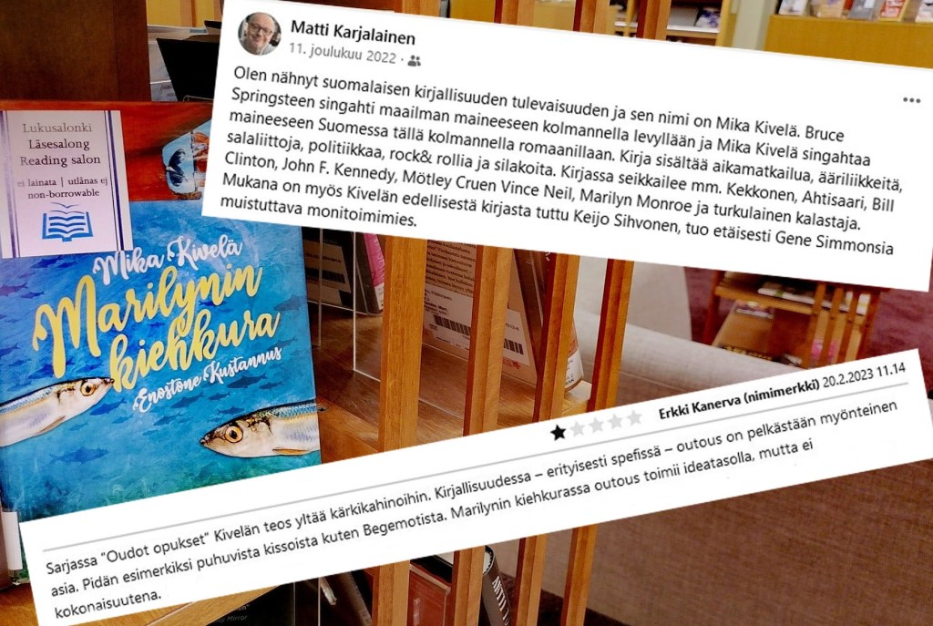 Kirjoitan parhaillaan tulevaa neljättä romaaniani. Edellisestä kirjasta saamani palaute auttaa jaksamaan tätä pöljää touhua. Enkä tarkoita vain kehuvia mielipiteitä. Kuvassa on kaksi palautteen ääripäätä. Arvostan molempia. Ilman näitä kirja katoaa ja kuolee.