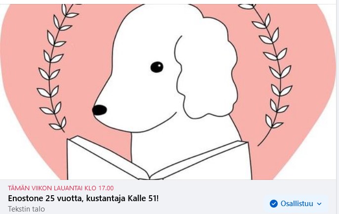 Tervetuloa Enostonen ja kustantajan juhliin Tekstin talon permantosaliin klo 17.00! Tilaisuus toimii samalla Enostonen tupaantuliaisjuhlana Tekstin talon hienoihin tiloihin.