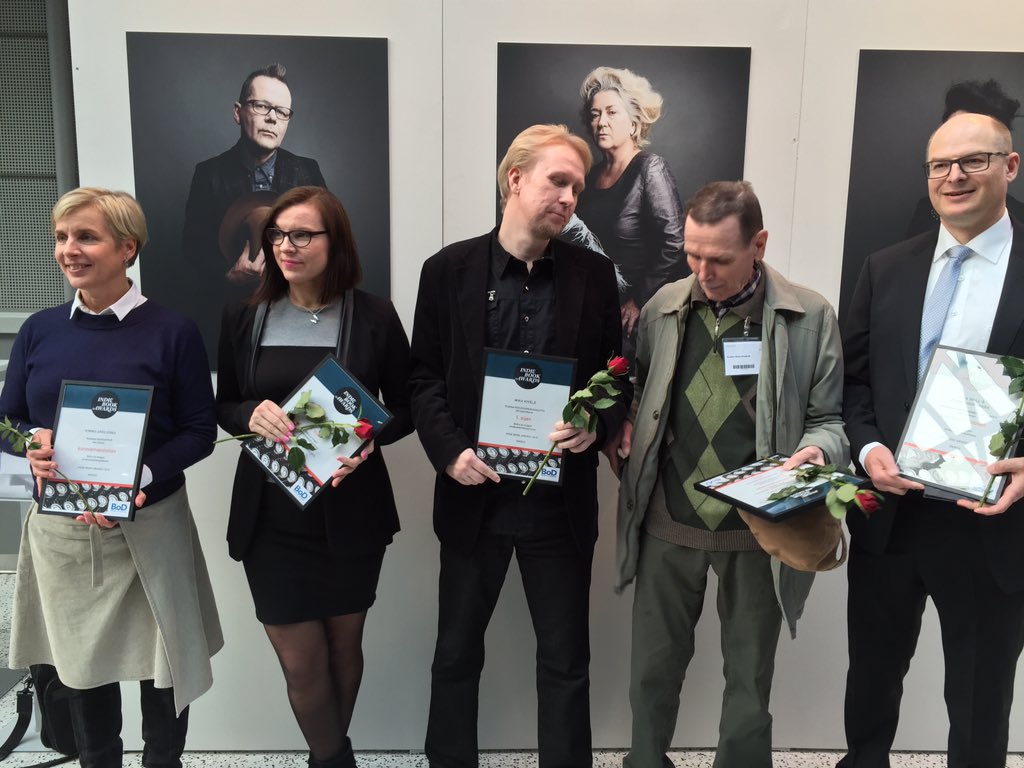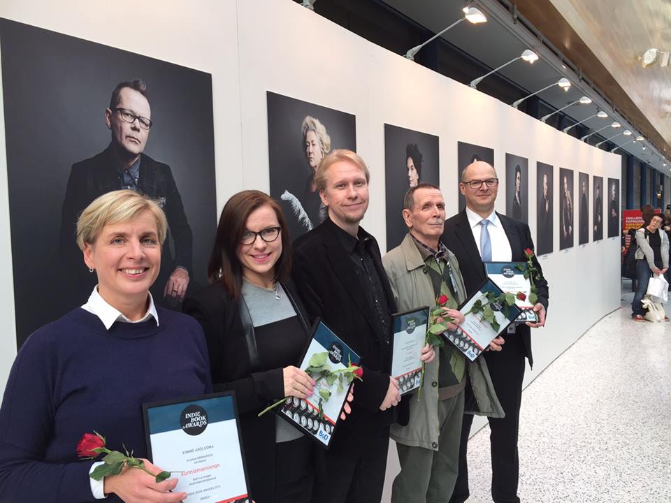 Indie Book Awards 2015 palkitut: kunniamainitun Kimmo Aroluoman puolesta Krista Aroluoma, 2.palkinto Leena Yliportimo, voittaja Mika Kivelä, kunniamainitut Jouko Niemivaara ja Juha Wall.